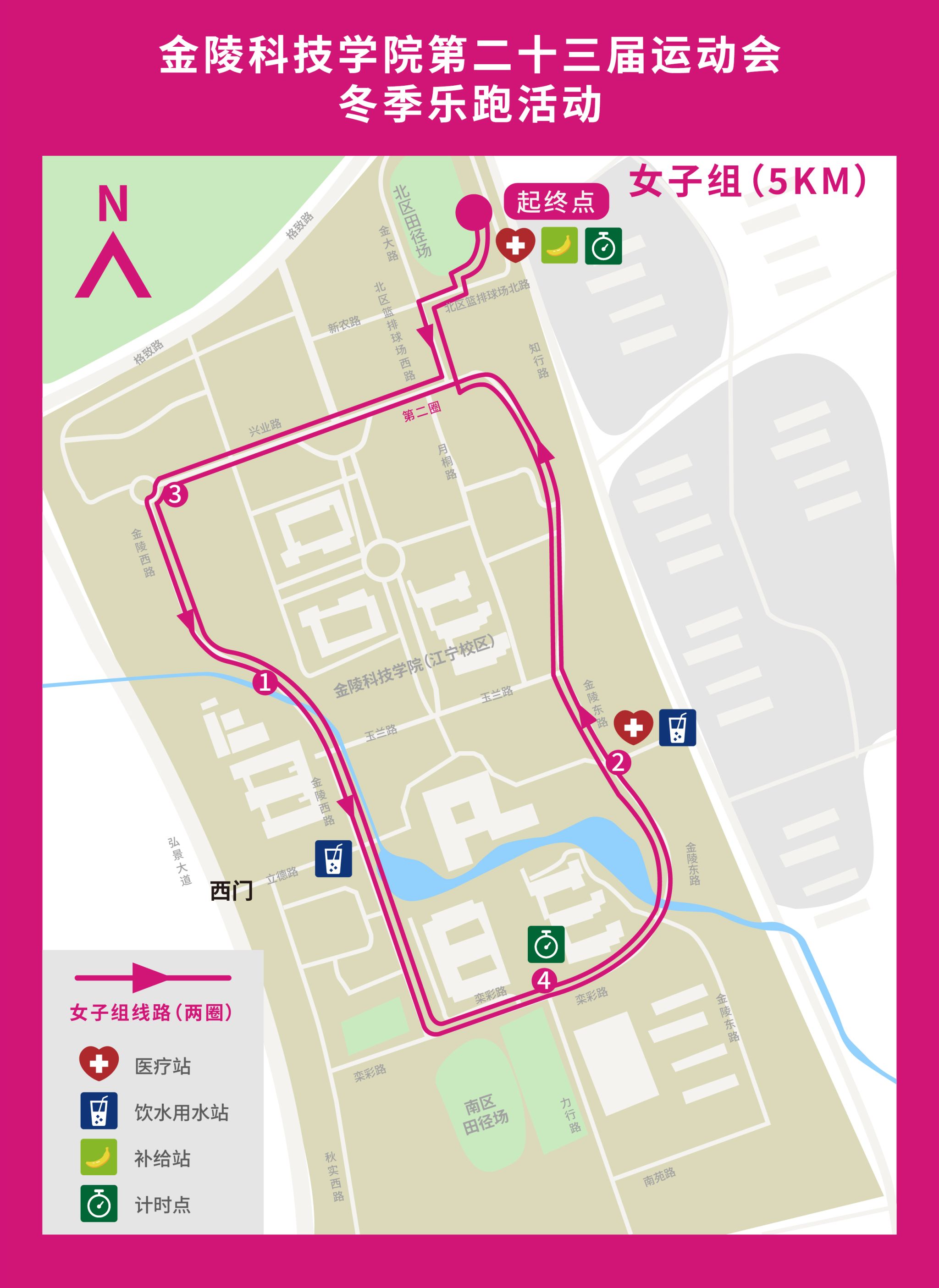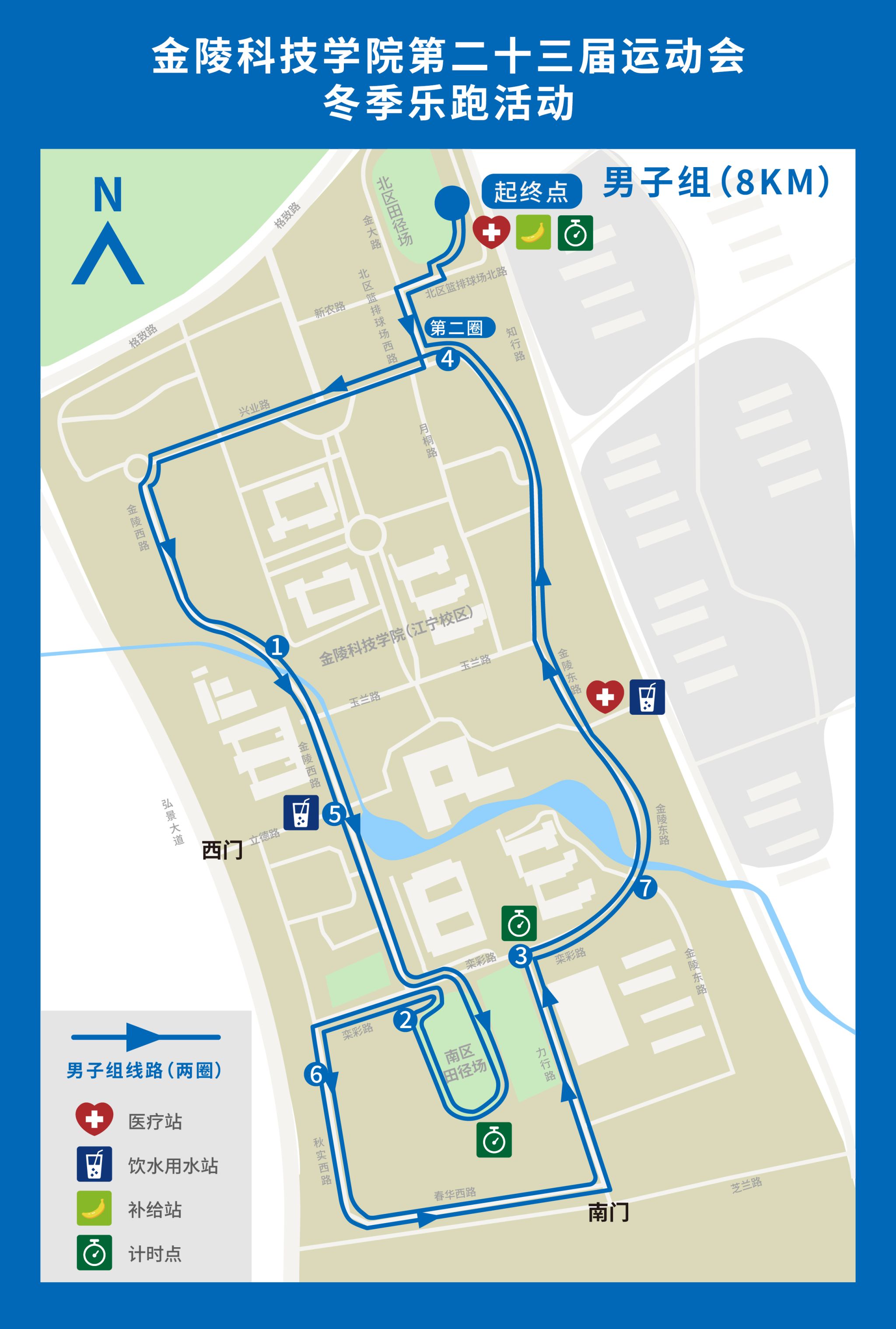 附图一:北区田径场主席台 — 北区篮排球场北路 — 北区篮排球场西路 — 兴业路 — 金陵西路(在拐入栾彩路前根据指示牌内容提前靠左行进) — 栾彩路(靠左侧行进) — 南区田径场 — 栾彩路 — 秋实西路 — 春华西路 — 力行路 — 栾彩路 — 金陵东路(第一圈完成时靠左行进按原路线继续绕圈,第二圈完成时靠右冲刺) — 北区篮排球场西路 — 北区篮排球场北路