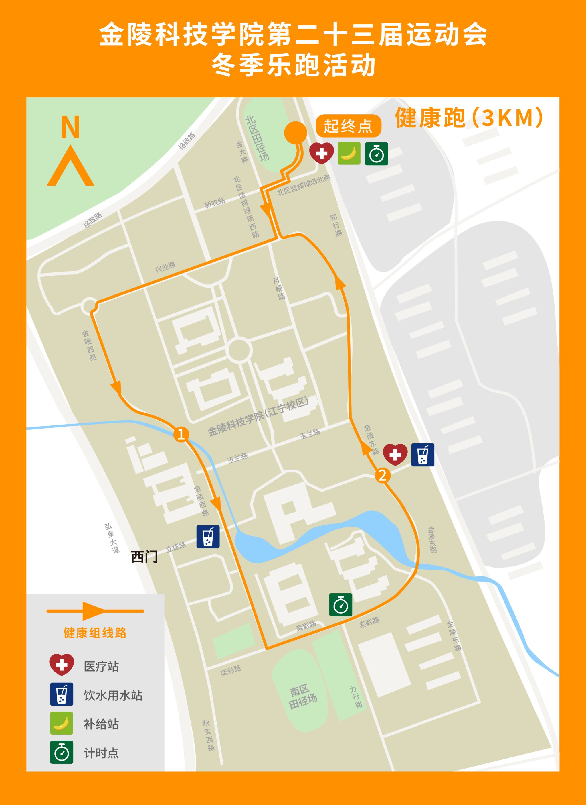 附图二:北区田径场主席台 — 北区篮排球场北路 — 北区篮排球场西路 — 兴业路 — 金陵西路(在拐入栾彩路前根据指示牌内容提前靠左行进) — 栾彩路(靠左侧行进) — 金陵东路(第一圈完成时靠左行进按原路线继续绕圈,第二圈完成时靠右冲刺) — 北区篮排球场西路 — 北区篮排球场北路