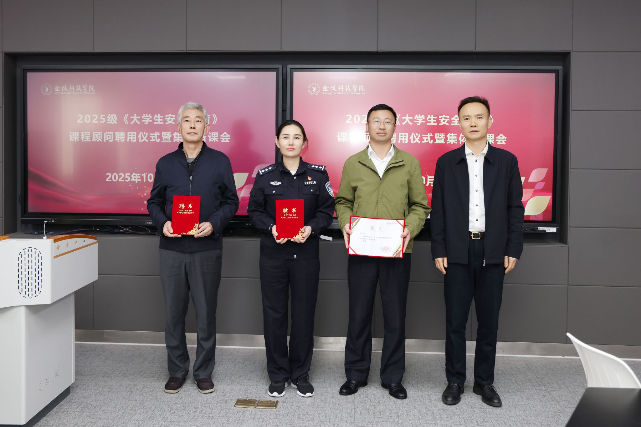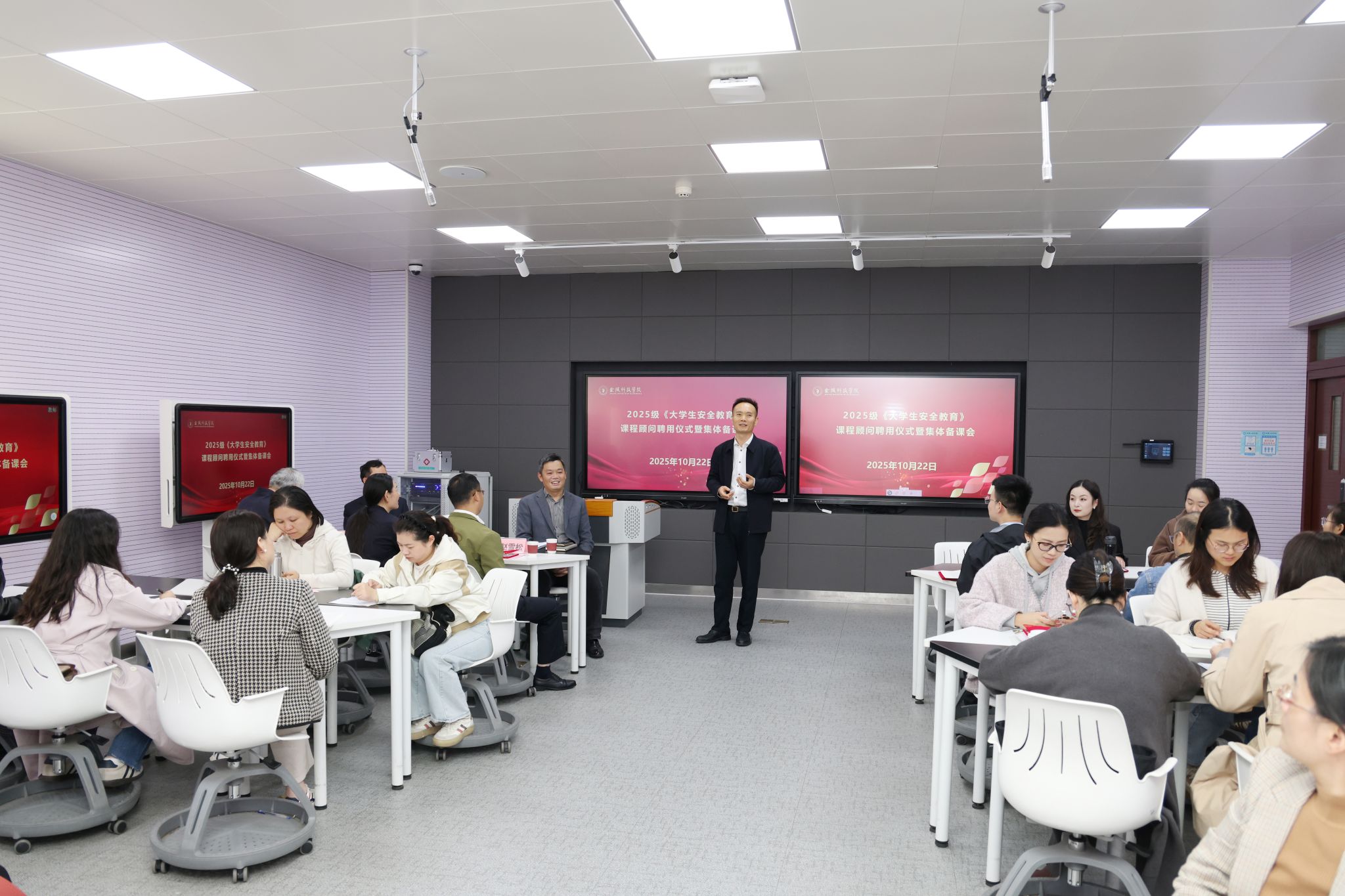 10月22日下午,我校2025级《大学生安全教育》课程顾问聘用仪式暨集体备课会在知行楼A418智慧教室举行。南京市公安局江宁分局高新区派出所副所长李琳、南京工程学院保卫处处长张景胜、中国药科大学保卫处副处长赵雪松应邀参会,副校长王延光出席会议并讲话,2025级《大学生安全教育》课程全体任课教师参加会议。会议由保卫处副处长卓士磊主持。